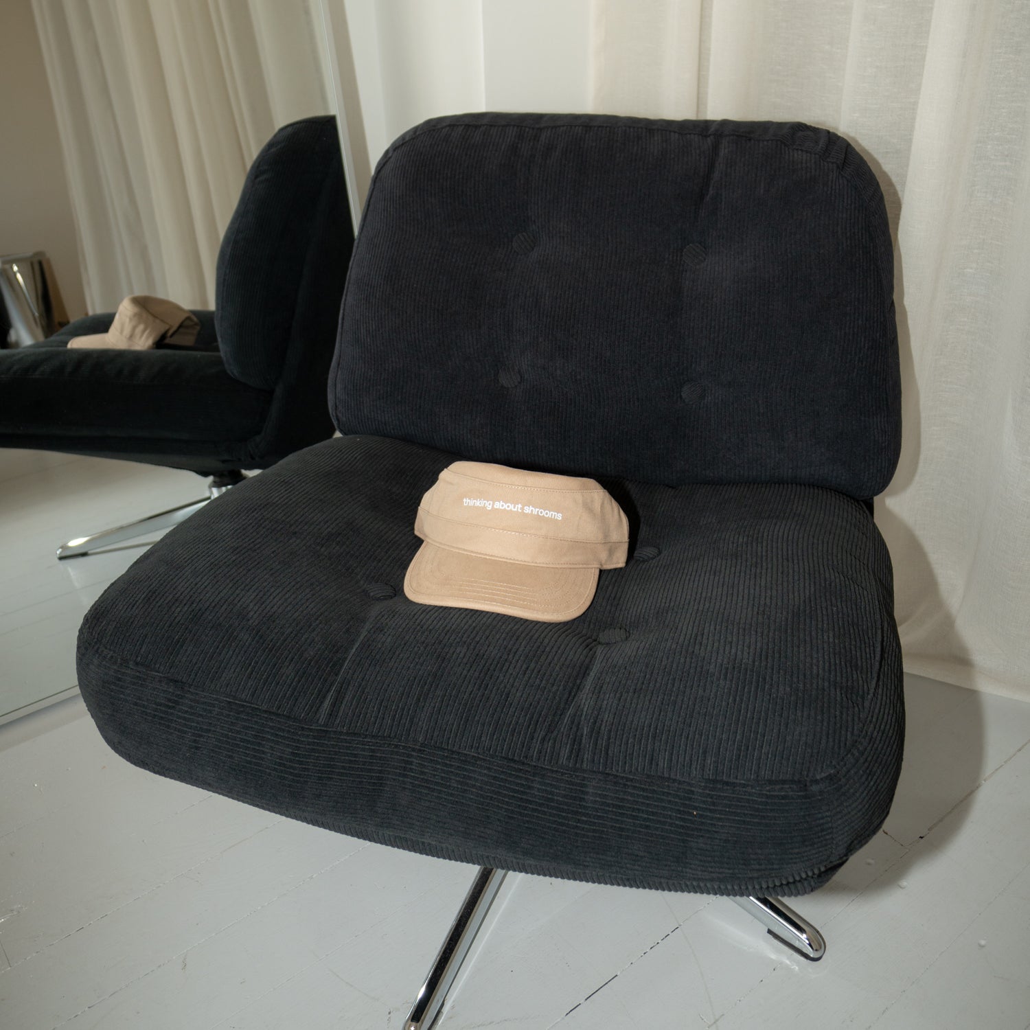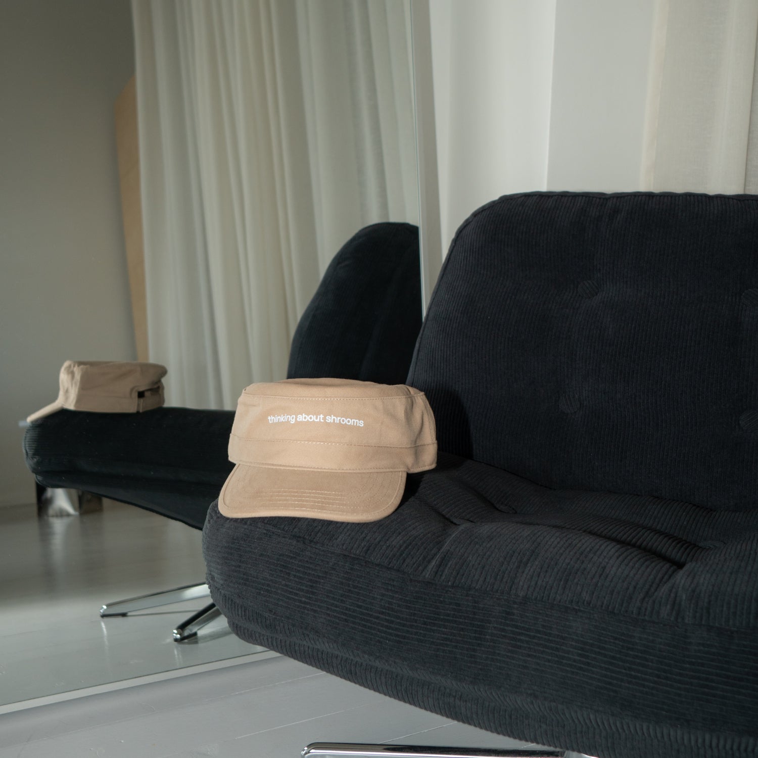 Šī cepure, smilšu tonī ar izšuvumu “thinking about shrooms”, dod Tev 100% atļauju publiskās vietās aizplūst domās par labāku nākotni.